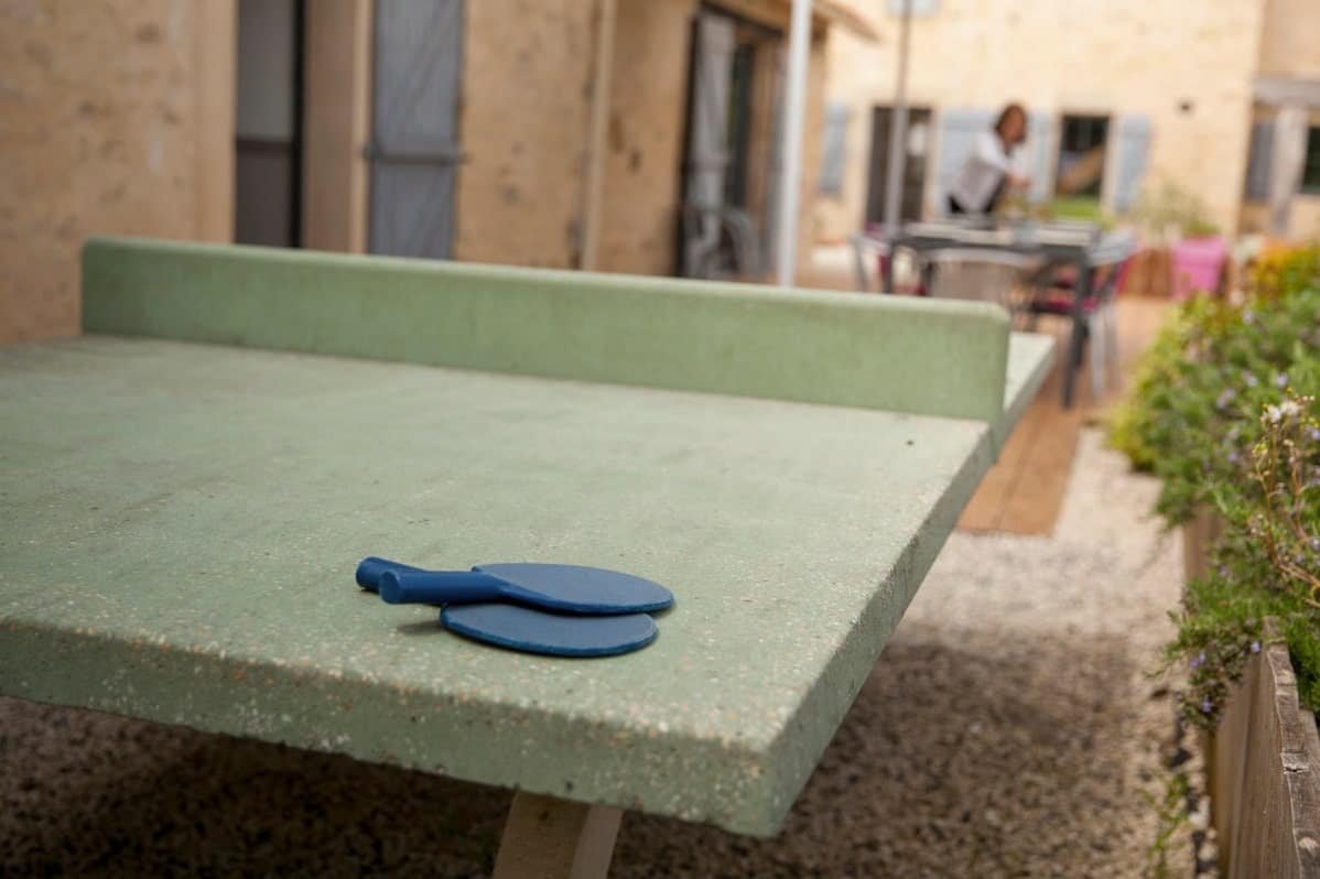 Elle est équipée de 2 tables et leurs chaises et d’un coin salon-détente qui, aux beaux jours, peut prendre place sur la terrasse extérieure.